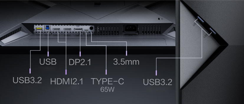 Equipped with dual HDMI 2.1, one DisplayPort 2.1, a USB-C port supporting 65W reverse charging, and multiple USB expansion ports, the monitor facilitates seamless multi-device connectivity and KVM switching. It also includes dual 5W built-in speakers, Light FX ambient lighting, a retractable headphone hook, and a fully adjustable ergonomic stand (height, swivel, tilt) for enhanced comfort and convenience.